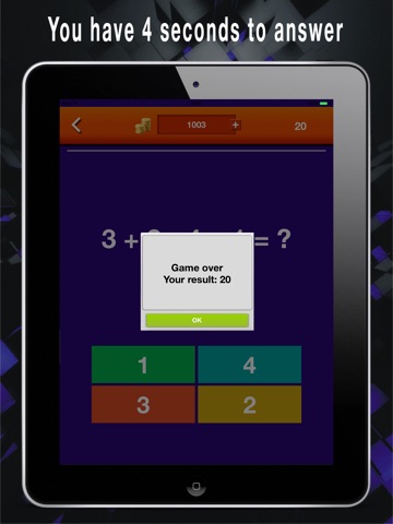This is a math game which all the questions and answers are combined by 1, 2, 3 or 4, plus and minus. See the question and choose the correct answer between 1, 2, 3 and 4. But you only have 4 seconds to answer. Give the correct as answer as fast as you can!