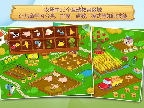 * 趣味的农场是儿童学习后的奖励,在农场游戏中儿童将可以学习到各种分类、排序、点数、模式等知识技能。