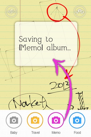 Tap a ‘Memo shot’ button, a photo will be saved to ‘Memo’ album.