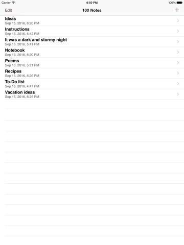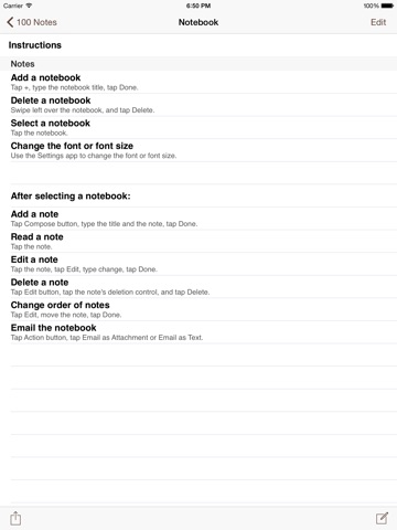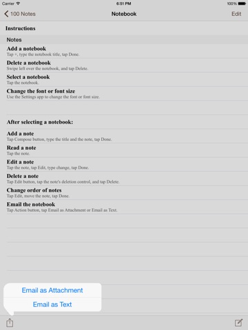 100 Notes allows you to create notes and group your notes into notebooks. Notebooks can be emailed as a .txt file attachment or as inline text. Notebooks are automatically sorted alphabetically.