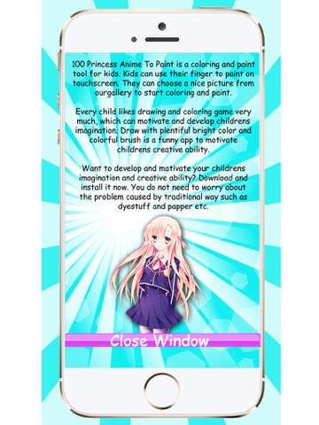 100 Princess Anime To Paint is a tool for coloring for the children. The children can use his fingers or light pen to color on the tactile screen of his intelligent telephone. 100 Princess Anime To Paint has a wide gallery where there can be chosen a great quantity of images to color as well as hundreds of available colors in our palette.