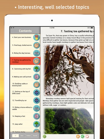 This application is consist of 100 things worth doing in life! There are a detailed description, diagrams, and images. All topics are chosen well and divided into 7 categories. Using this application you will be able to mark passed chapters, to choose performance date and leave your images and impressions for each chapter!
