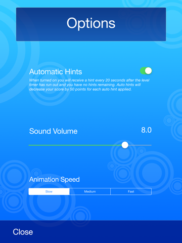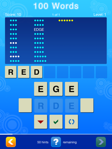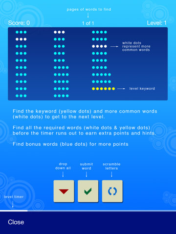 Solve the puzzle by finding the keyword (yellow dots) and more common words (white dots) to get to the next level. Find the bonus words (blue dots) to score even higher. The game ends when you complete all 100 levels. Start a new game and get new words.