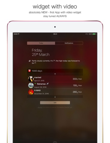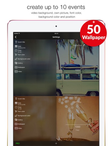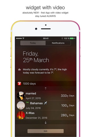 A great new feature is the video-widget. You do not have to open the app anymore to see your countdowns. Your events will be visible directly on your main screen if you add the widget function – even with your personal background video.