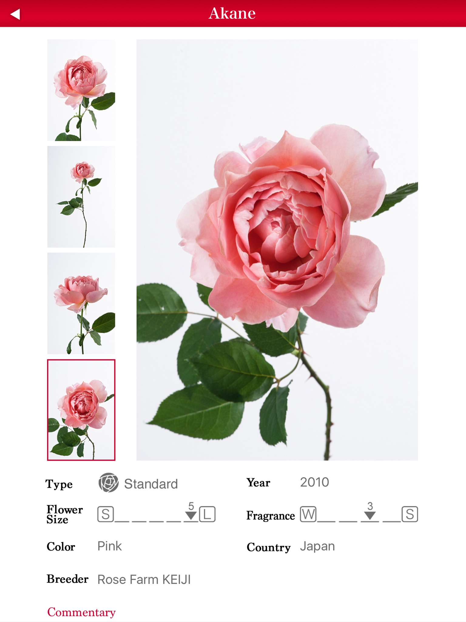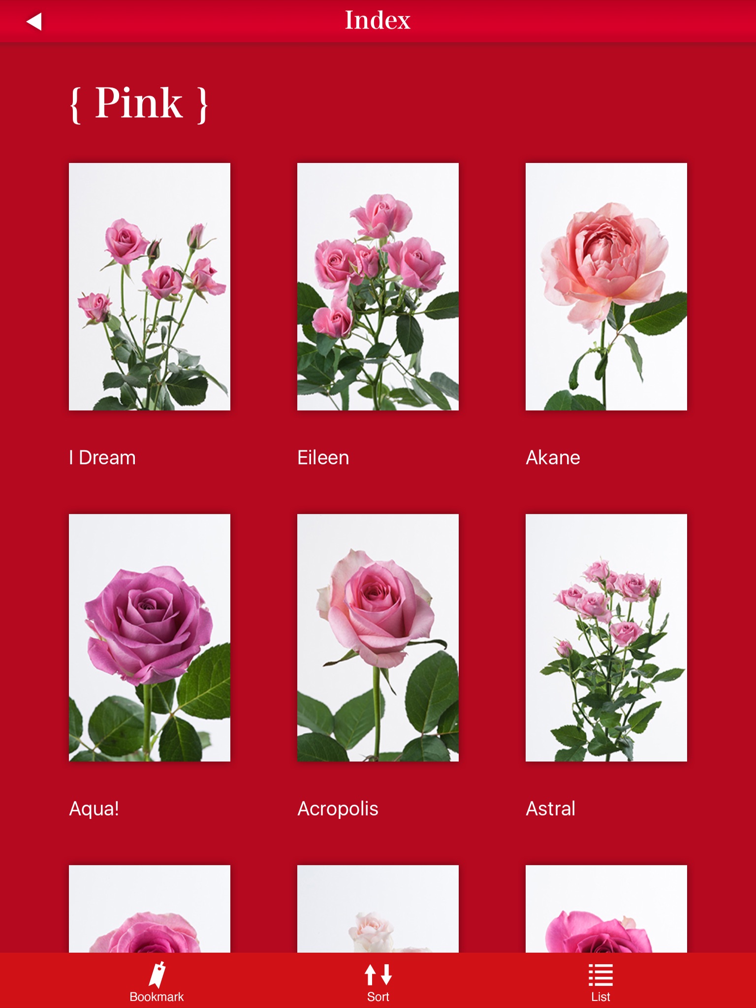 You can browse all the rose varieties on the app. You can sort the list by color, size, fragrance and other characteristics.