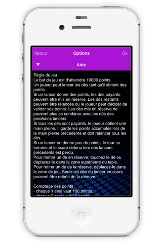If a throw gives points, the paying dice can be put in reserve. The remaining dice can be relaunched or the player can decide to validate his points. Dice put in reserve cannot harmonize any more with the dice of the next throw.