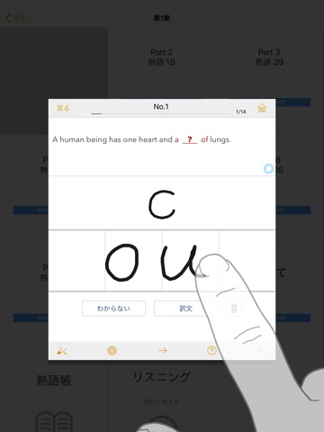 本製品は英熟語1,000語とその例文が「出る順」で4つの章にまとめられています。各章内には弊社の英単語学習アプリ「英単語ターゲット1900(5訂版)」と同様の3ステップの学習方法が用意され、一歩一歩確実に勉強を進める事が出来ます。また各分類ごとのチェックや選択問題の成績を棒グラフで表示しますので進捗状況が常に確認できます。テスト問題では手書き入力にも対応しているので、熟語を書いてしっかり覚えることができます。