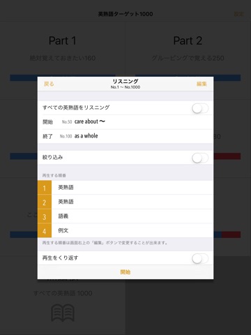 加えて1,000語すべての英熟語、語義、例文に音声データが用意されていますので、通学中や就寝前など画面を見ずにリスニングで学習を進める事が出来ます。またアプリを終了してバックグラウンドでの再生も可能です。