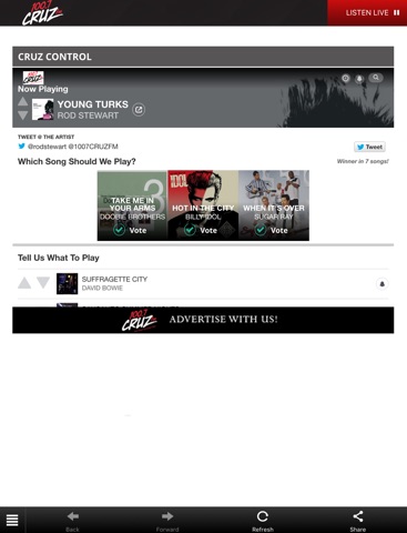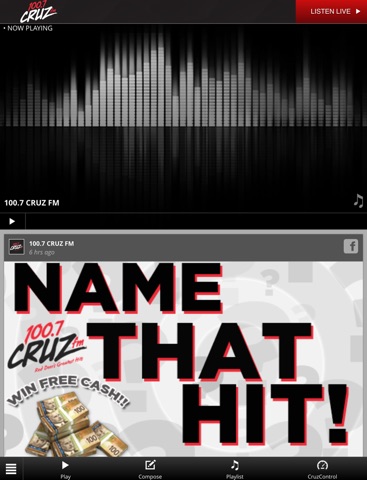 100.7 Cruz FM plays the biggest hits from artists such as Bon Jovi, Queen, Bryan Adams, AC/DC, Fleetwood Mac, Aerosmith, Blondie, U2, Rolling Stones, Madonna, The Tragically Hip, David Bowie, Police, Eagles, Nickelback, ZZ Top, Red Hot Chili Peppers, Van Halen, Pat Benatar, KISS and Bruce Springsteen.