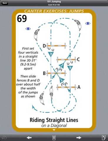 The 101 Jumping app is simple to use. It is set up like a deck of cards, each card featuring one of the 101 exercises. The top face of the card provides a setup or an illustration of the exercise. Faces two, three and four take you step by step through the exercise and provide reminders, hints, and tips for what to keep in mind and how to solve problems.