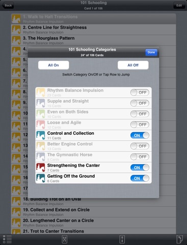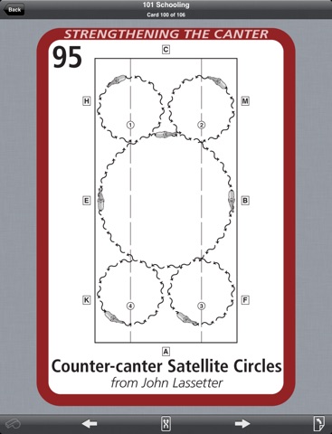 The 101 Schooling mobile app is easy to use. It is set up like a deck of cards, each card featuring one of the 101 exercises. The top face of the card provides an arena diagram or an illustration of the exercise. Faces two and three take you step-by-step through the exercise and provide tips for what to do if it’s not working. Additional highlights of the 101 Schooling app include: