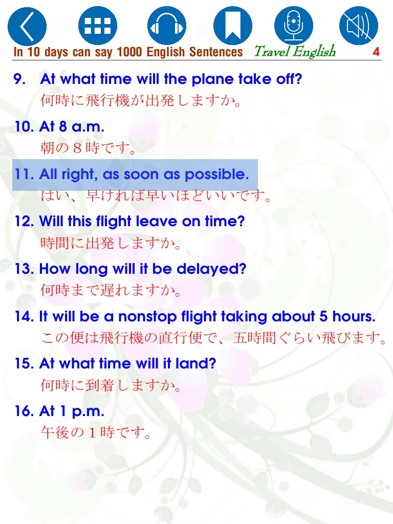 「10日目に英語の1000句を話せる(In 10 days can say 1000 English Sentences – Travel English)」 は126 ページを含んで、スマートフォン手に入るとき、「いつでもかどこでも英語を習う」という標準により編纂される。編纂するのうちに、予想外のエラーに影響されやすいので、この本に対応した内容に仕上げるように読者から貴重寄付を受領される望みます。誠に有難うございます、良く効果勉強をお祈り!我々のスマート・ブック-イ・ブック(iBooks)を使用するとき、以下ように役に立ちます:髪本値段(伝統な本)よりこの本値段のほが安い;我々の本を買うとき、読者は一回お金を支払うだけで、失ったり、裂けの心配ない永遠本を使用する及び追加支払わなくて新本更新するとき、すべての権利を享有される;この本は音(オーディオ)を添付して統合されて、読むとき、各句記号をつける。分からないどこか再聞きたいとき、その句に手を触ったら、あなたははっきり再聴きます; 以外に、イ・ブック(iBooks)は特集音声録音(読み方を練習したあなたの音声)の機能もある。あなたは、アイコン・ヘッドホン(聞いて、書きます)に押すとき、あなたはキーボードか手で聞いた句の再聞いて、書かれるように機能を添付するスクリーンを出頭します。これは、あなたに本を読んで言語を学習することを便利するようにデジタル技術時代での我々の突破一つです。