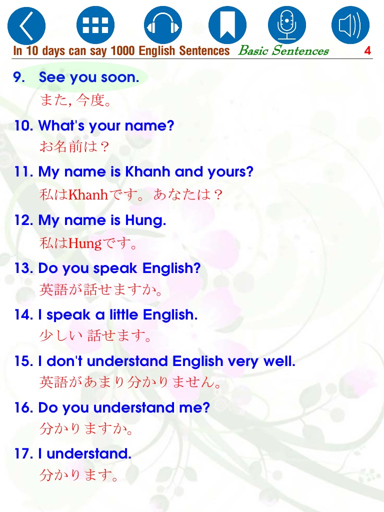 「10日目に英語の1000句を話せる (In 10 days can say 1000 English Sentences – Basic Sentences)」 は127 ページを含んで、スマートフォン手に入るとき、「いつでもかどこでも英語を習う」という標準により編纂される。編纂するのうちに、予想外のエラーに影響されやすいので、この本に対応した内容に仕上げるように読者から貴重寄付を受領される望みます。誠に有難うございます、良く効果勉強をお祈り!我々のスマート・ブック-イ・ブック(iBooks)を使用するとき、以下ように役に立ちます:髪本値段(伝統な本)よりこの本値段のほが安い;我々の本を買うとき、読者は一回お金を支払うだけで、失ったり、裂けの心配ない永遠本を使用する及び追加支払わなくて新本更新するとき、すべての権利を享有される;この本は音(オーディオ)を添付して統合されて、読むとき、各句記号をつける。分からないどこか再聞きたいとき、その句に手を触ったら、あなたははっきり再聴きます; 以外に、イ・ブック(iBooks)は特集音声録音(読み方を練習したあなたの音声)の機能もある。あなたは、アイコン・ヘッドホン(聞いて、書きます)に押すとき、あなたはキーボードか手で聞いた句の再聞いて、書かれるように機能を添付するスクリーンを出頭します。これは、あなたに本を読んで言語を学習することを便利するようにデジタル技術時代での我々の突破一つです。