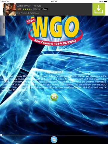 102.9 WGO, Minot North Dakotas new country music station, featuring 7 in-a-row music sweeps and Jeff and Owen in the morning! Fast and frequent news and weather plus long 7 song music sweeps. And dont miss the 5 oclock mash-up, the perfect way to wrap up your workday. If its new, if its now, its on 102.9 WGO!