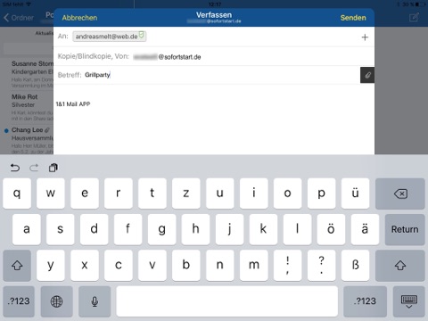 nach der installation der App lässt sie sich zwar mit dem mail-konto Verbinden, hat sich auch per imap die Emails aus dem Postfach, beim Versuch eine Email zu versenden, scheitert es an richtigen Einstellungen für den Versand, ein Menüpunkt dafür wird nicht angezeigt, der 1&1-support ist ratlos. Rät davon ab die 1&1 Mail app zu nutzen!