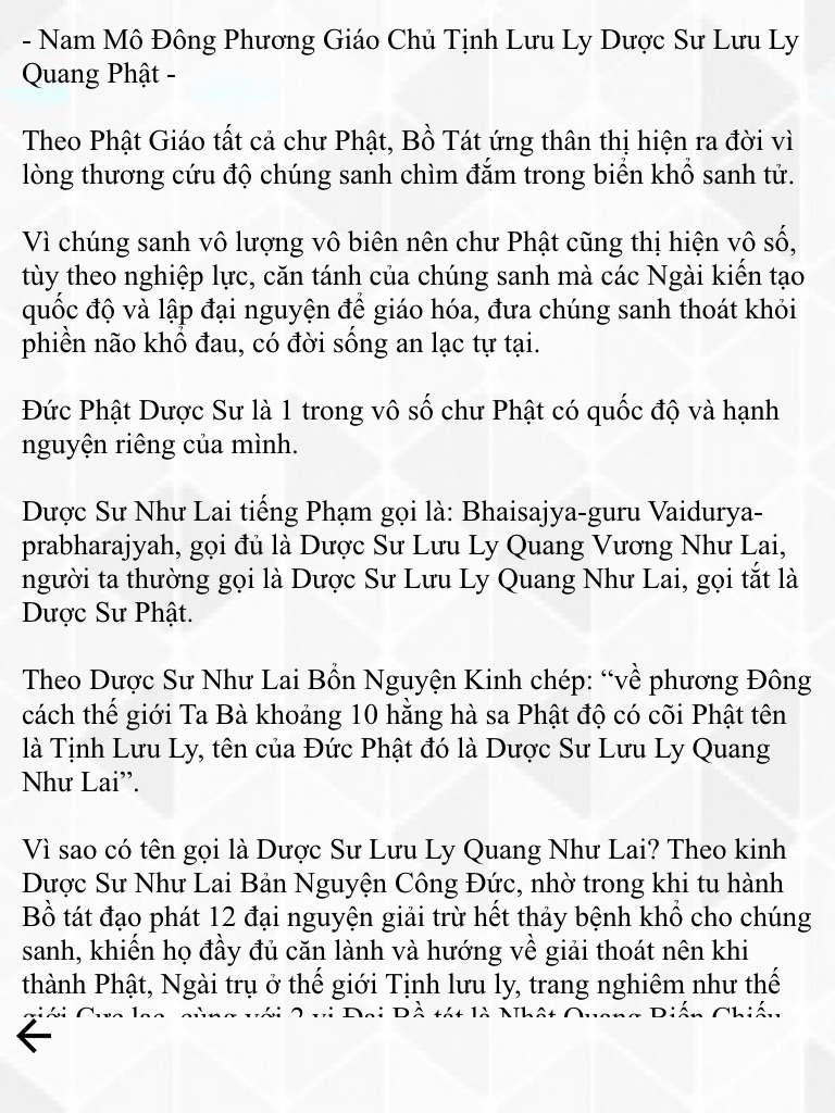 Phật Dược Sư nghĩa là "vị Phật thầy thuốc", còn gọi là Dược Sư Lưu Ly Quang Phật, Dược Sư Lưu Ly Quang Vương Như Lai , Dược Sư Như Lai, Dược Sư Lưu Ly Như Lai.