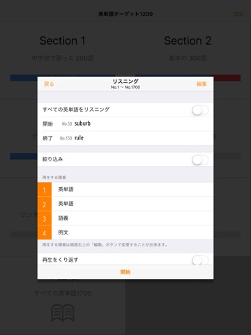 ターゲット1900で勉強開始したのですが、本アプリレベルの単語に穴が多いことに気が付き、こちらに移行しました。 まず、テストから始め、覚えている単語と覚えなければならない単語に振り分けます。 テストで「多分」が選択出来るのは、その作業にたいへん役立ちます。 覚えなければならない単語に全てマーキングを入れたら、マーキングで絞り込み、ひたすらトレーニング。覚えた単語は、マーキングを外します。 トレーニングは、例文を収録音声に合わせて音読するのが、効果的です。 300件強に絞り込んだ単語帳は、宝物です。 #以下、追記でバグ報告です。 「リスニング」機能で、シャッフルオンの場合に、他のセクションに移動しても、単語の選択が、前にいたセクションのままのことが有ります。 対症療法としては、シャッフルをオフオンすれば、ちゃんと選び直すのですが、…