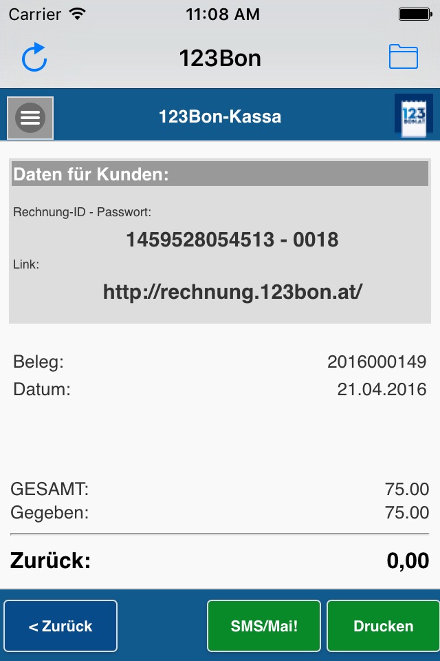 Der Beleg wird entweder am Kassendrucker, am PC Drucker ausgedruckt oder via Mail oder SMS elektronisch an den Kunden übergeben.