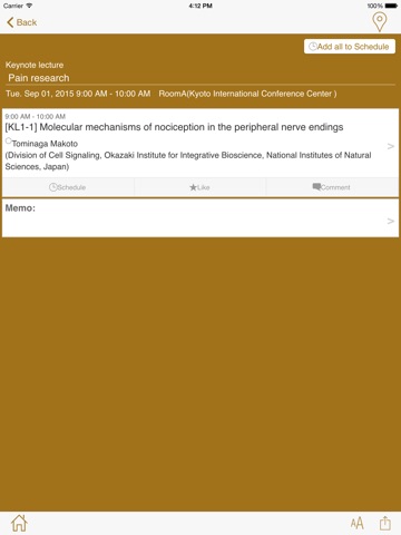 You can add presentations to My Schedule by tapping [Schedule] button, by which you can access the sessions/presentations directly from My Schedule.