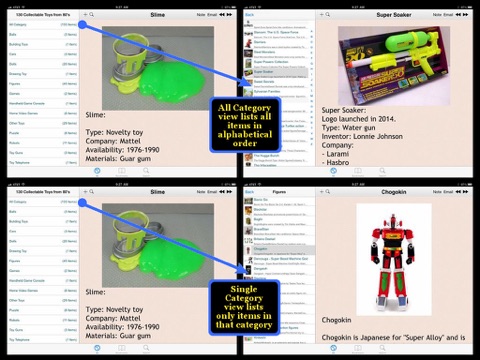 130 Collectable Toys from 80s is an application that contains over 130 types of classic collectable toys we all enjoyed during our childhood. The toys are categorized into different categories for easier reference. Each entry of this encyclopedia contains detailed information about the toy/game and their background information