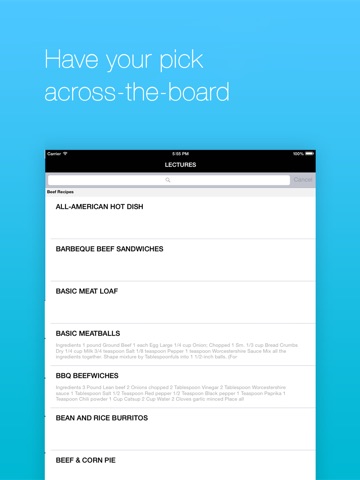 This App features 1,500 easy-to-follow, flavorful recipes for meat and fish of all kinds, including dishes with pork, lamb, and turkey, too. Search intuitively by fish or meat type and get instantly inspired to choose one of the hundreds of recipes in each category. Whether you are planning a party or simply looking for fresh ideas for weeknight dinners, 1,500 Meat & Fish Recipes will become your ultimate guide. Use it in the grocery store to find and save your favorite recipes for the week!