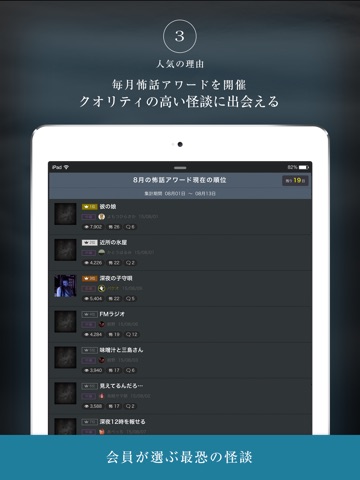 投稿された怖い話は、「怖い」の数、「コメント」の数、作品が読まれた回数を集計し、ランキングを付けています。そのランキングに基づき、毎月その月で最も怖いと評価された作品に贈る「怖話アワード」を開催しています。また、今年の一番怖い話を決める「怖話オブザイヤー」も毎年開催しています。受賞を目指して、ぜひ、怖い話をご投稿ください。