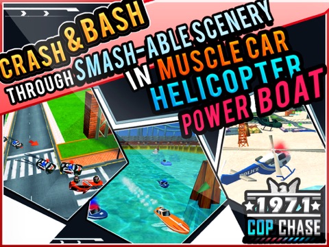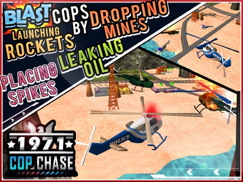 Cop Chase Shooting & Racing is an intense action racing game which pits your driving skills against cops desperate to takedown in wild chase. Crash and bash through smash-able scenery in Muscle Car, Helicopter, Power Boat and takedown Cops by launching rockets, dropping mines, leaking oil, placing spikes on the way…etc.