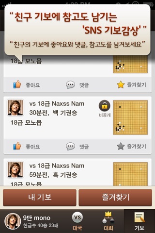 나의 기보와 친구의 기보가 타임라인상에 펼쳐지는 기보를 매개로 한 SNS입니다.