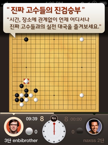 시간, 장소에 관계없이 언제 어디서나 진짜 고수들과의 실전 대국을 즐겨보세요.