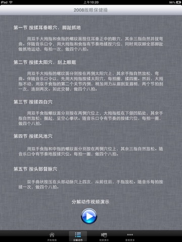 眼保健操是一种保健体操项目,它可以提高人们的眼保健意识,调整眼及头部的血液循环,调节肌肉,改善眼的疲劳。眼保健操是根据祖国医学推拿、经络理论,结合体育医疗综合而成的按摩法。它通过对眼部周围穴位的按摩,使眼内气血通畅,改善神经营养,以达到消除睫状肌紧张或痉挛的目的。
