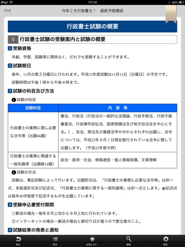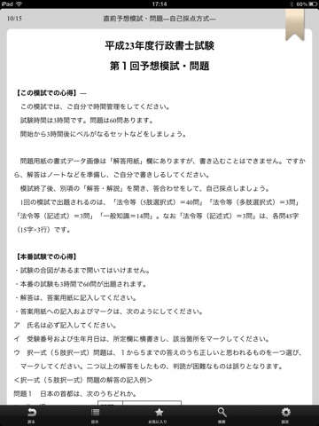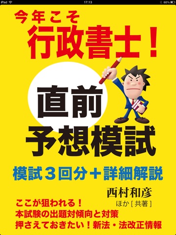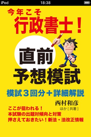 このアプリケーションは、『今年こそ行政書士! 直前予想模試2011年版』(自由国民社刊)を電子化したものです。編著者は、資格試験指導では大人気の西村和彦先生です。単なる模試ではなく、「解答・解説・講評」による細部にわたる丁寧な解説がみなさんの合格への道をサポートします!