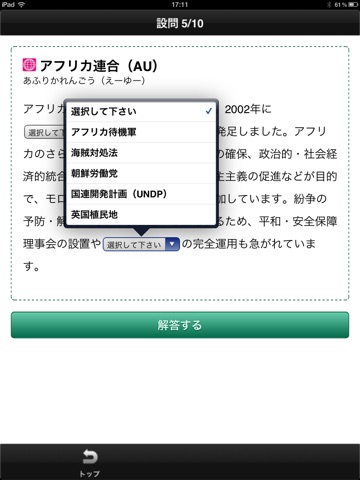 ▼「基礎語をチェック」は、このアプリの最大のボリュームをほこります。すべての用語解説に空欄語彙選択問題を設け、回答したらその場で選択問題の正否を判定します。出題は、ランダム方式です。1回10問をセットに出題します。回答途中の場合は、「前回の続きから解く」を選べば続きから問題に取り組めます。1回10問を答えて、回答合わせをしたあとは、「間違えた問題だけを解く」をクリックすれば、正答できなかった問題だけを解くようになっています。