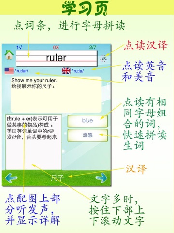 多种听写模式:方便学习者听录音时在练习本上进行传统的听写,也可以在iphone/ipad上输入生词,由机器判断正误。