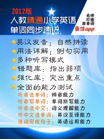 本软件配套人教社小学英语课本《英语(精通)(三年级起点)(2012版)》(目前已出版“三年级上册”、“三年级下册”和“四年级上册”,教材封面左上角印有“教育部审定2012”和“2013”字样), 按单元进行同步词汇背诵。