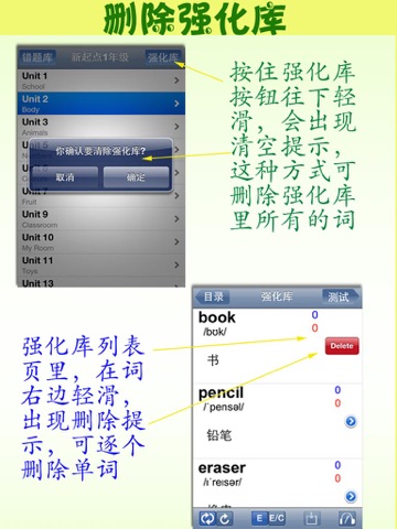强化库:可以将某些重点词或难词划入“强化库”(相当于生词本),进行强化学习。可以通过滑动”强化库“按钮的方式,清空强化库里的词条。