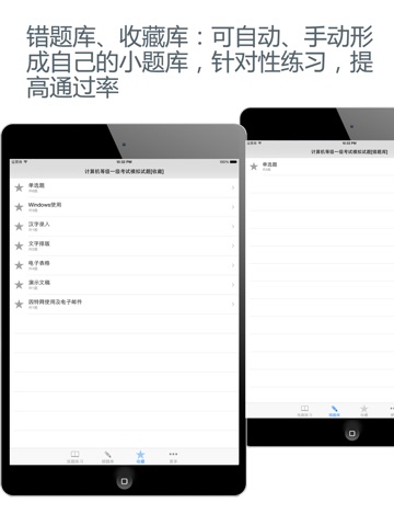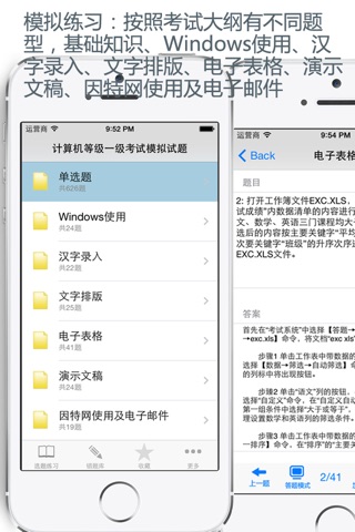 1、课程模拟练习:针对习题强化练习,可选择不同题型,基础知识,Windows使用、汉字录入、文字排版、电子表格、演示文稿、因特网使用及电子邮件。并可手动将易错或未牢固掌握的题加入收藏,以便反复练习。