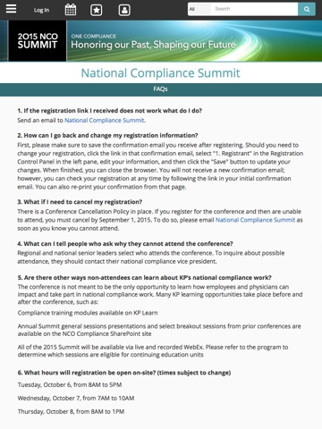 The National Compliance Summit will be held on October 6-8th, 2015 in San Diego, California. Login to view Sessions and Papers saved as favorites. View schedules, locations, floor plans, and people. Attendees will now be able to facilitate their experience at the meeting using the mobile app.