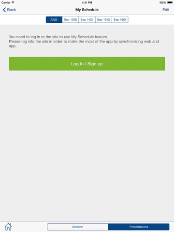 You can add presentations to My Schedule by tapping [Schedule] button, by which you can access the sessions/presentations directly from My Schedule.