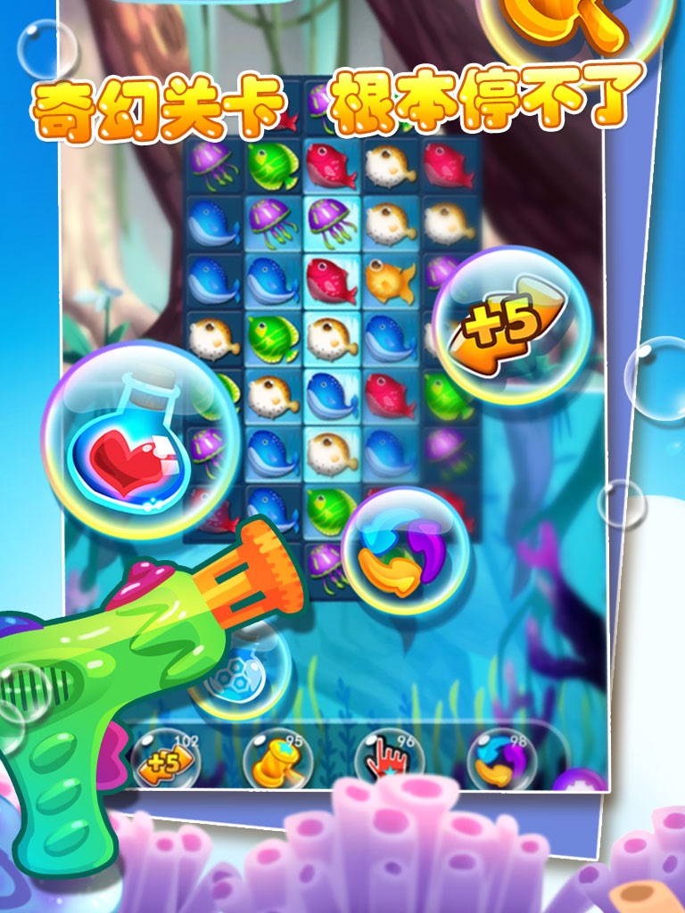 好玩的海洋题材消除游戏,它将带你畅游海底世界,体验一段梦幻的冒险之旅!无边无际的海洋中蕴藏着数不尽的宝藏,而它正在遭受着破坏,你需要通过不断的消除,将海底的垃圾清除干净,消灭那些邪恶的海底生物!游戏的玩法简单而有趣,将三个或者以上的同类鱼儿连到一起,就能触发无比华丽的消除效果!而且我们在经典的三消玩法上做出了多个创新,加入了寻宝、超级消除等元素,将更多的快乐带给你!游戏的画面非常精美,华丽的破碎消除效果惊爆你的眼球,让你仿佛置身缤纷梦幻的海底世界,伴随着悦耳动听的音乐,在视觉与听觉上获得极大的享受!