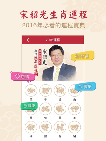而今年,中國傳統文化綜合傳播平臺——靈機文化,將與宋韶光老師強強聯手,以宋老師風行海內外多年的生肖運程預測為覈心,專業打造宋韶光2016猴年生肖運程APP,讓廣大用戶在手機平板即可瞭解生肖喜忌,增福化煞等事宜,讓廣大用戶在手機平板即可瞭解生肖喜忌,增福化煞等事宜,讓大家一年到頭都能隨手、隨時、隨地關注財富、感情運勢,盡享先機。