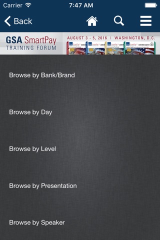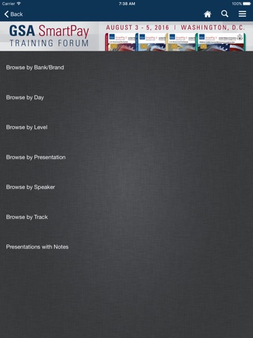 The 2016 GSA SmartPay Forum mobile application allows you to view the schedule, presentations, posters, exhibitors and speaker details from the conference. Users can take notes adjacent available presentation slides and draw directly on slides inside the app. Note-taking is also available in the posters and exhibitors modules.
