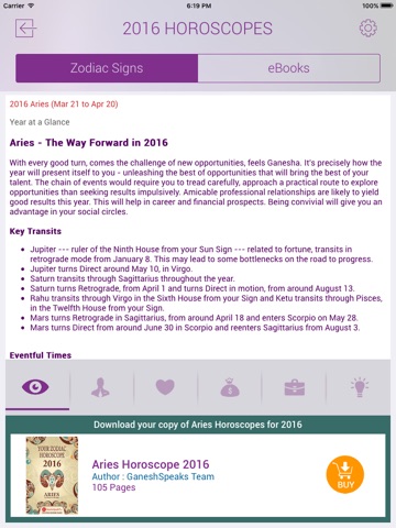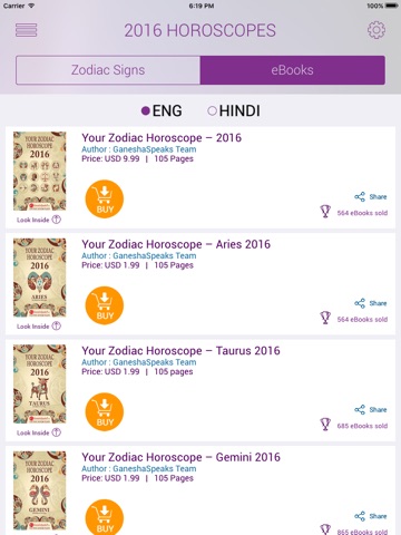 - Pick and Choose Your Book : Designed to give you Free previews for all 26 books available (13 English Books and 13 Hindi Books), this easy to navigate, user-friendly App gives you a chance to see first hand, the flow, content and language style of the books. Your Zodiac Horoscope 2016, for your convenience, is available in various versions. You can buy an all-inclusive version with predictions and articles for all the 12 Zodiac Signs. You also have the option to buy a specific Zodiac Signs book – for instance Aries (Aries book shall contain just the predictions for the the Zodiac Sign Aries) and likewise for all other Signs. The individual Zodiac Sign books too are available in both English and Hindi. Preview all the books for free, take your pick and buy the chosen one via In-App purchases.