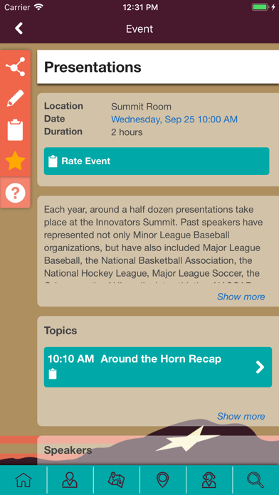• The “Events” tab allows you to browse by day and select sessions of interest to add to your schedule. It also shares pertinent session information, descriptions and tap-throughs to speakers’ bios.