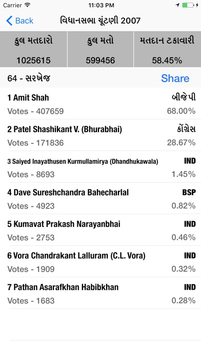 - Name of all candidates and number of Votes they got.