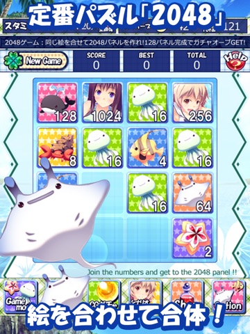 2048パズル + 南国の海!可愛いマンタやクジラのアイコンの2048ゲーム。