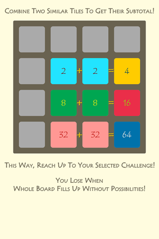 Whenever two same numbered tiles meet together, they get converted into one tile of their subtotal (2+2=4,4+4=8,...)