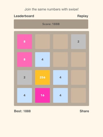 So how do you play this game? Swipe the numbers in the tiles. When the two similar numbers touch, they add up or merge into one. For example: when two, 2 tiles collide they become 4, when two 4s touch, they become 8 and so on and so forth. You win the game when you finally have two 1024 and have them touch each other. Simple game, right? Hah! Wait till you play it. One wrong move and it can be a deadlock!