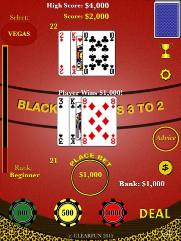 Games like this cure me of my urge to go to a casino. After losing 7 hands in a row in this app, I basically am cured of wanting to play blackjack for real money forever! As for the game itself, it plays really fast and easy, making it easy to play multiple rounds after the game has cleaned your virtual wallet in three hands (or am I the only one that gets the max every time?)