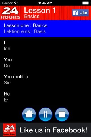 Too busy to enrol on a proper German language course or perhaps it is too expensive? Tell you what, youre not the only one and we now have a solution. This app is designed to work with your active lifestyle at your own pace! With the audio feature of this app, you can always learn while on the go. Whether you are driving, on the bus or train, jogging in the park or perhaps relaxing in bed, just plug in your earphones and start learning! This app gives you the easiest and most hassle free way to learn the German language!