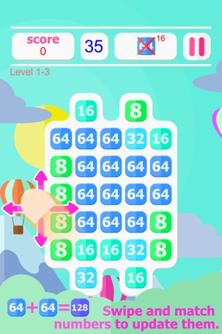 Swipe (Up, Down, Left, Right) to move the numbers. When two numbers with the same touch, they merge into one. The move is 0 or can not swipe numbers, Level Failed! Clear all order, Level Cleared!